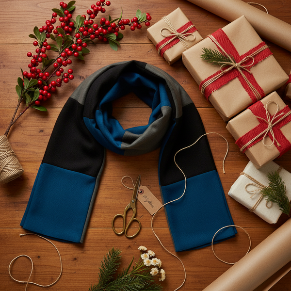 This is a luxurious merino wool patchwork scarf. Very cosy and warm to wear without the weight of a conventional scarf.