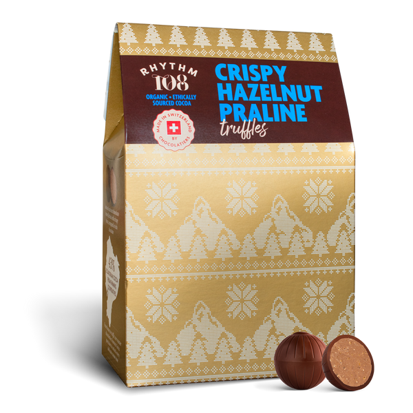 Each truffle is encased in velvety Swiss chocolate and filled with a silky hazelnut-cocoa centre, delicately flecked with crispy pieces. Crafted by Rhythm108's Master Chocolatiers in Switzerland, every step – from bean to truffle- is carefully guided to bring out the unique notes of each cacao bean.