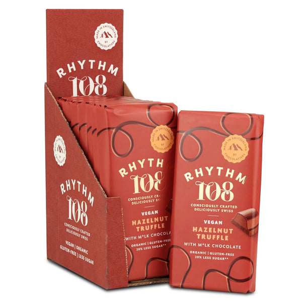 Rhythm108's Swiss vegan Hazelnut Truffle Chocolate Bar is the epitome of pure vegan chocolate luxury.