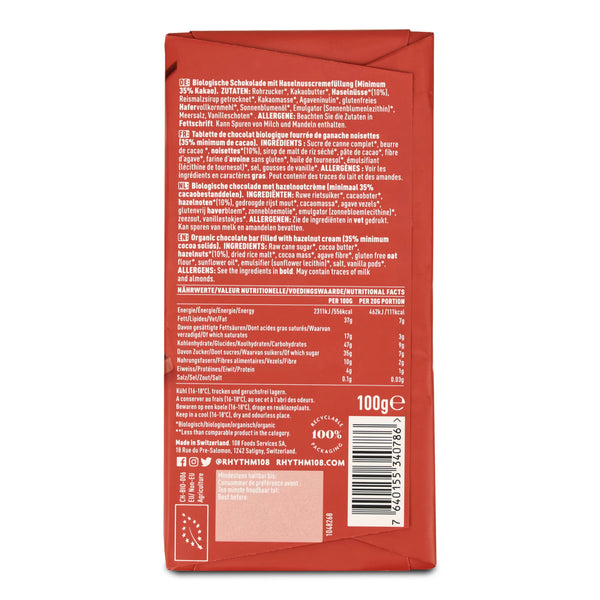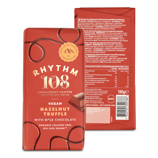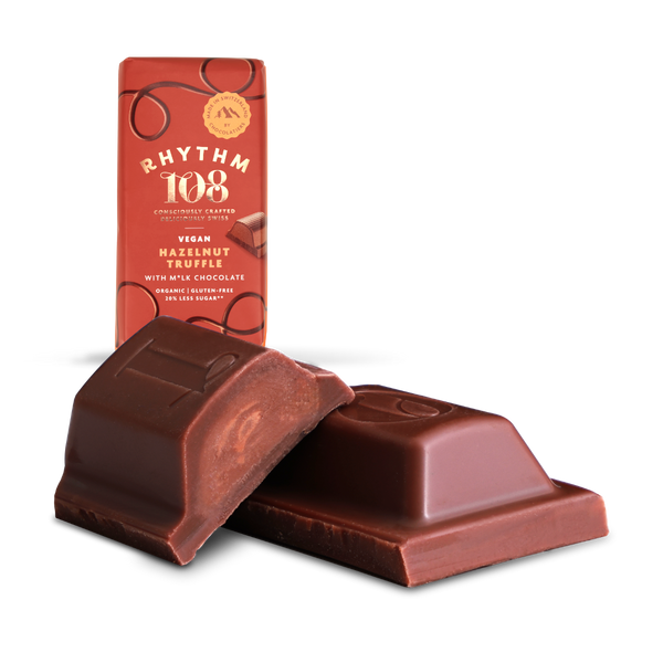 Filled with a delicious, creamy truffle hazelnut praline and coated in our signature Swiss vegan milk chocolate, like all of Rhythm108's bars, we believe it delivers the indulgence factor without the compromise.